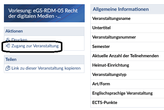Wenn Sie eine passende Veranstaltung gefunden haben, klicken Sie auf den Titel der Veranstaltung, um zur Anmeldeseite der Veranstaltung zu gelangen. In der linken Navigation wählen Sie bei den „Aktionen“ bitte „Zugang zur Veranstaltung“ aus, um sich für die Veranstaltung anzumelden. Im Normalfall werden Sie damit „vorläufig akzeptiert“, müssen aber noch von den Lehrenden endgültig zugelassen werden. Es besteht auch die Möglichkeit, dass es bestimmte Anmeldeverfahren gibt, bitte befolgen Sie dann die entsprechenden Hinweise.